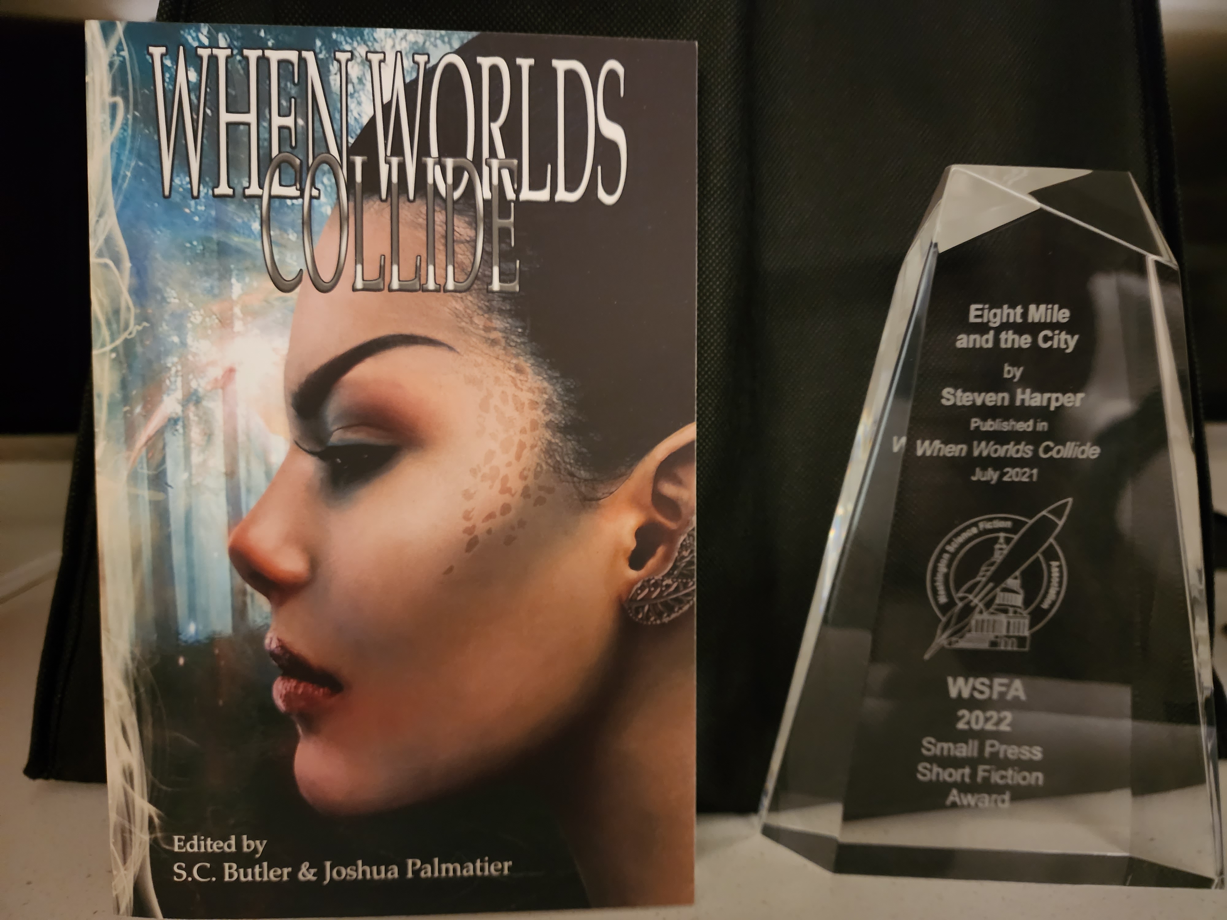 “Eight Mile and the City” by Steven Harper, WHEN WORLDS COLLIDE, ed. by S.C. Butler & Joshua Palmatier, Zombies Need Brains LLC (July 2021), WINNER!!! of the WSFA Small Press Award 2022, Buy the book: Kindle; Trade Paperback; Kickstarter Edition